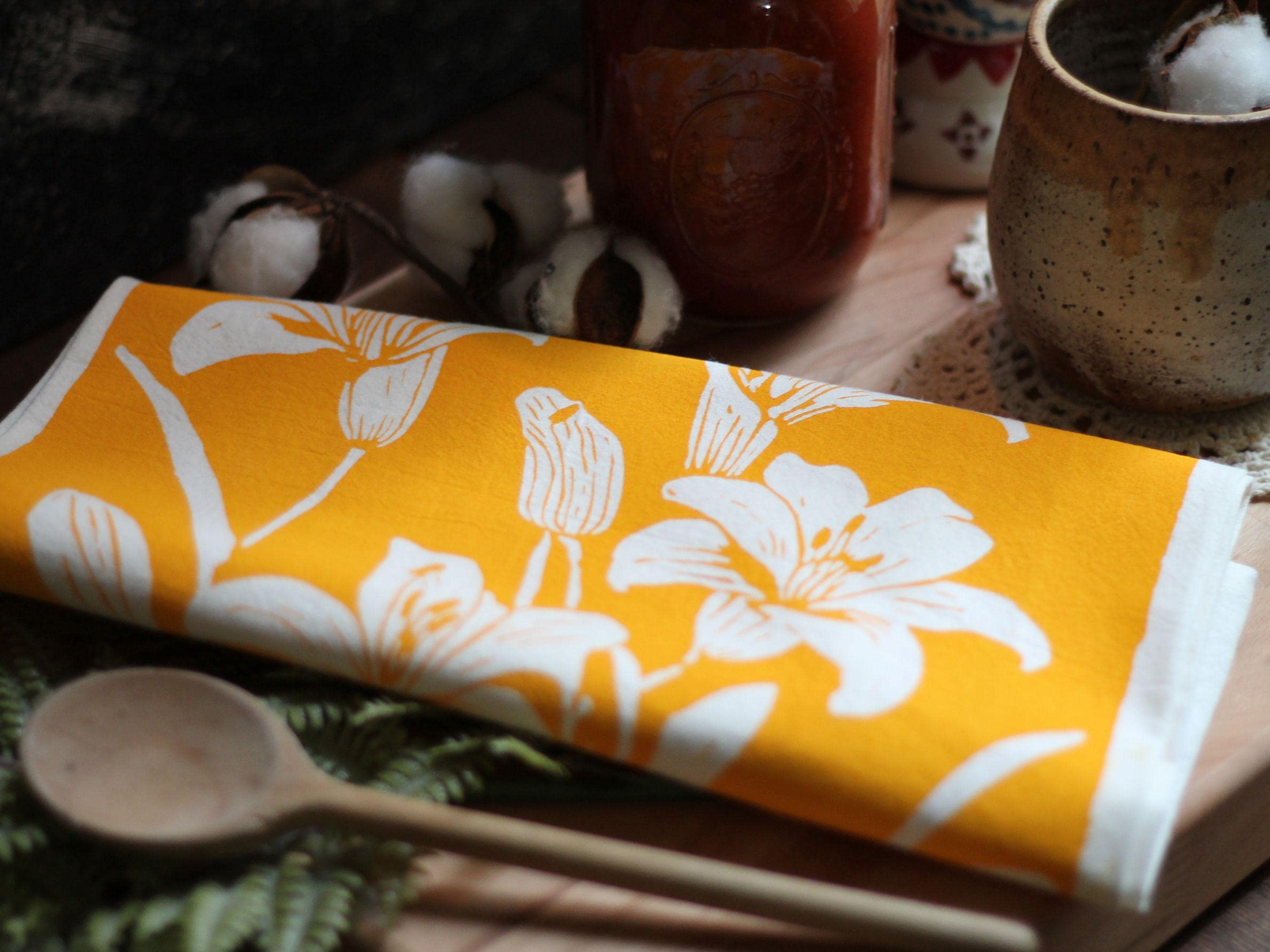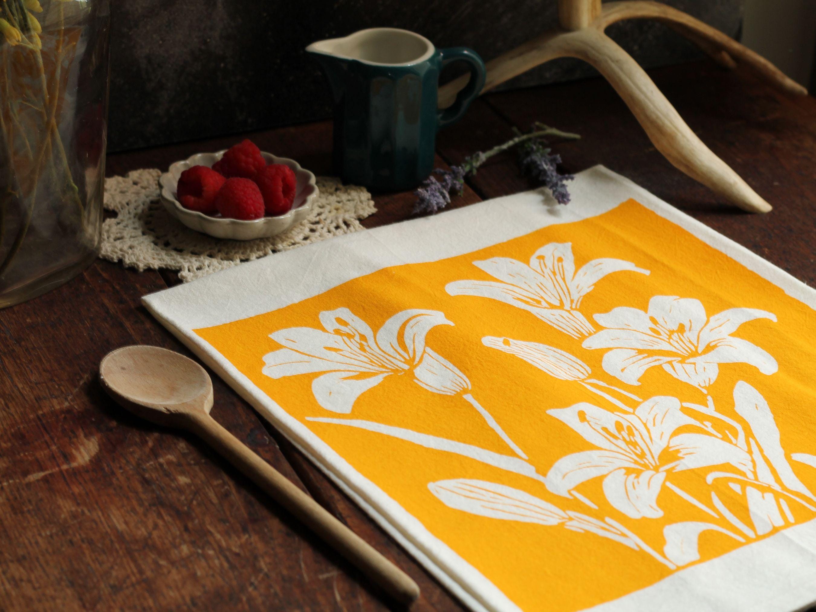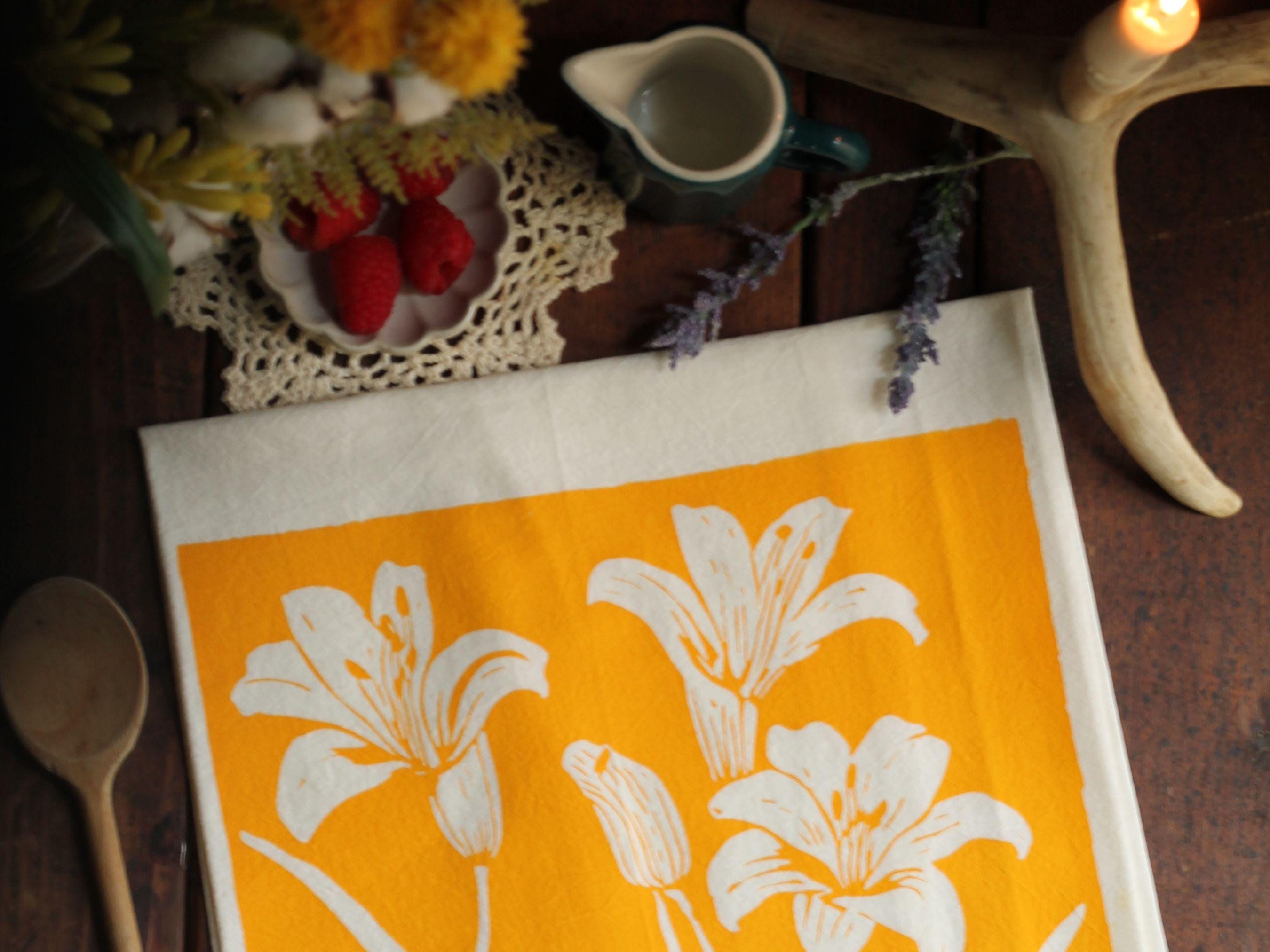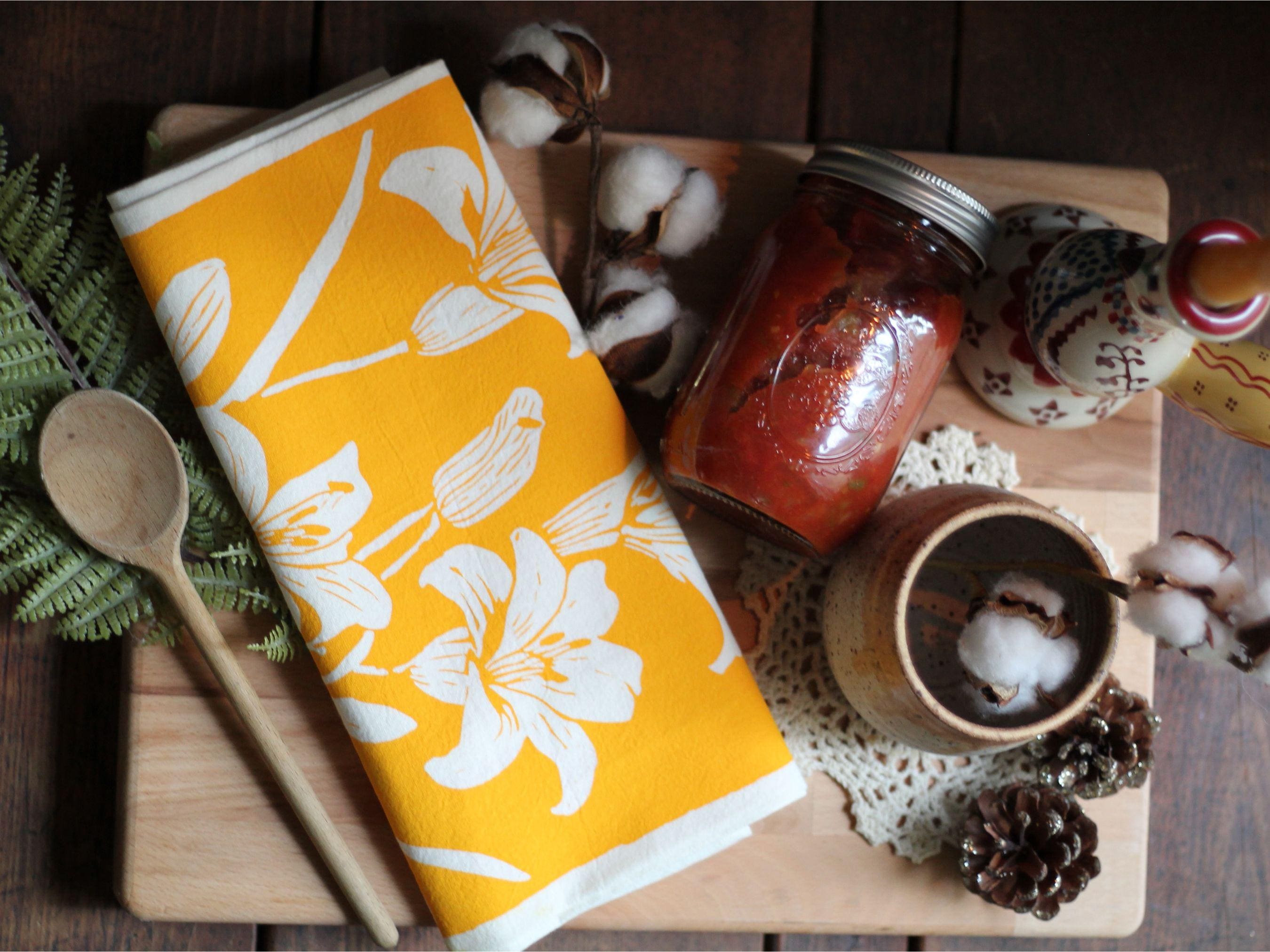 Bring a touch of artistry and color to your everyday kitchen routine. This hand-printed lily design adds a cheerful pop of floral charm—perfect for cozy fall kitchens, holiday baking days, or a thoughtful gift during the winter season. Beautiful enough to display, but functional enough for daily use.