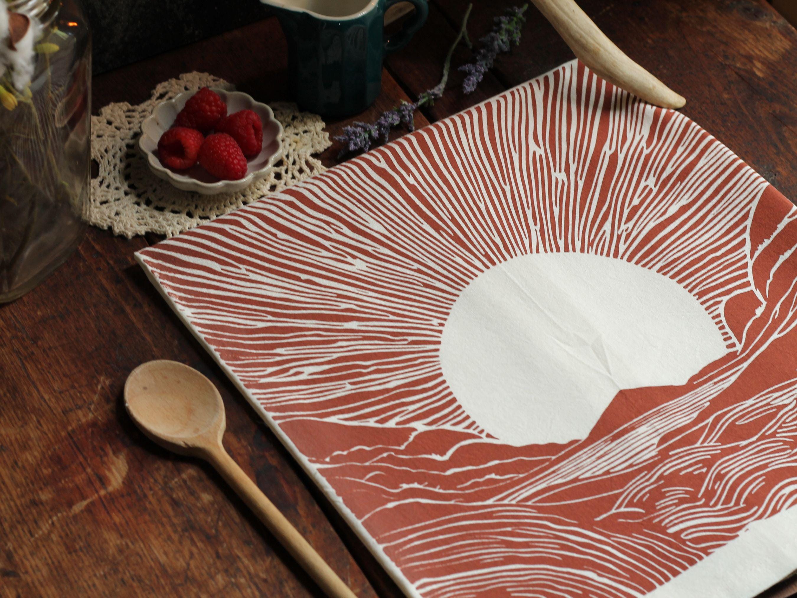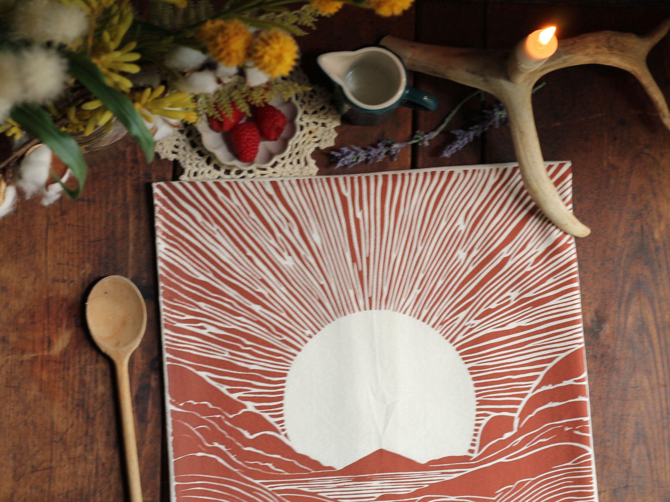 Bring the beauty of nature into your kitchen with this hand-printed tea towel featuring a serene sunrise over rolling hills and the ocean. Designed and printed by me, this artisan cotton kitchen towel is perfect for coastal kitchens, mountain cabins, or anyone who loves nature-inspired decor.
