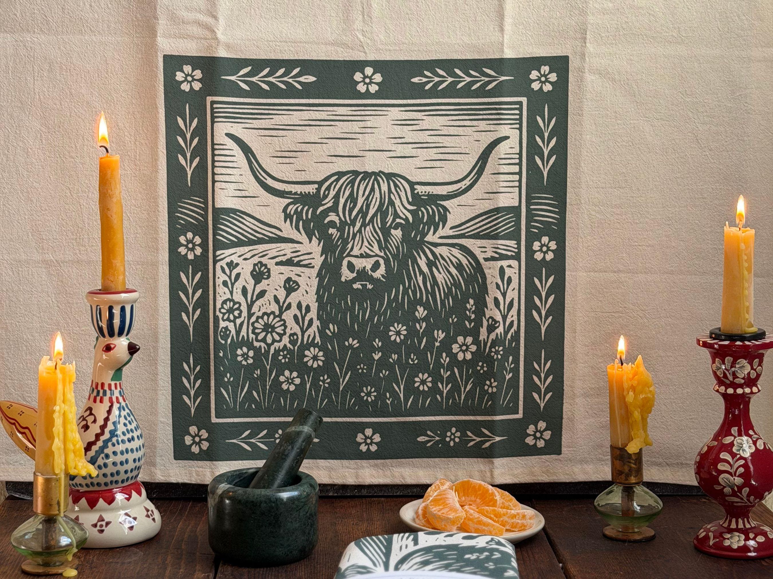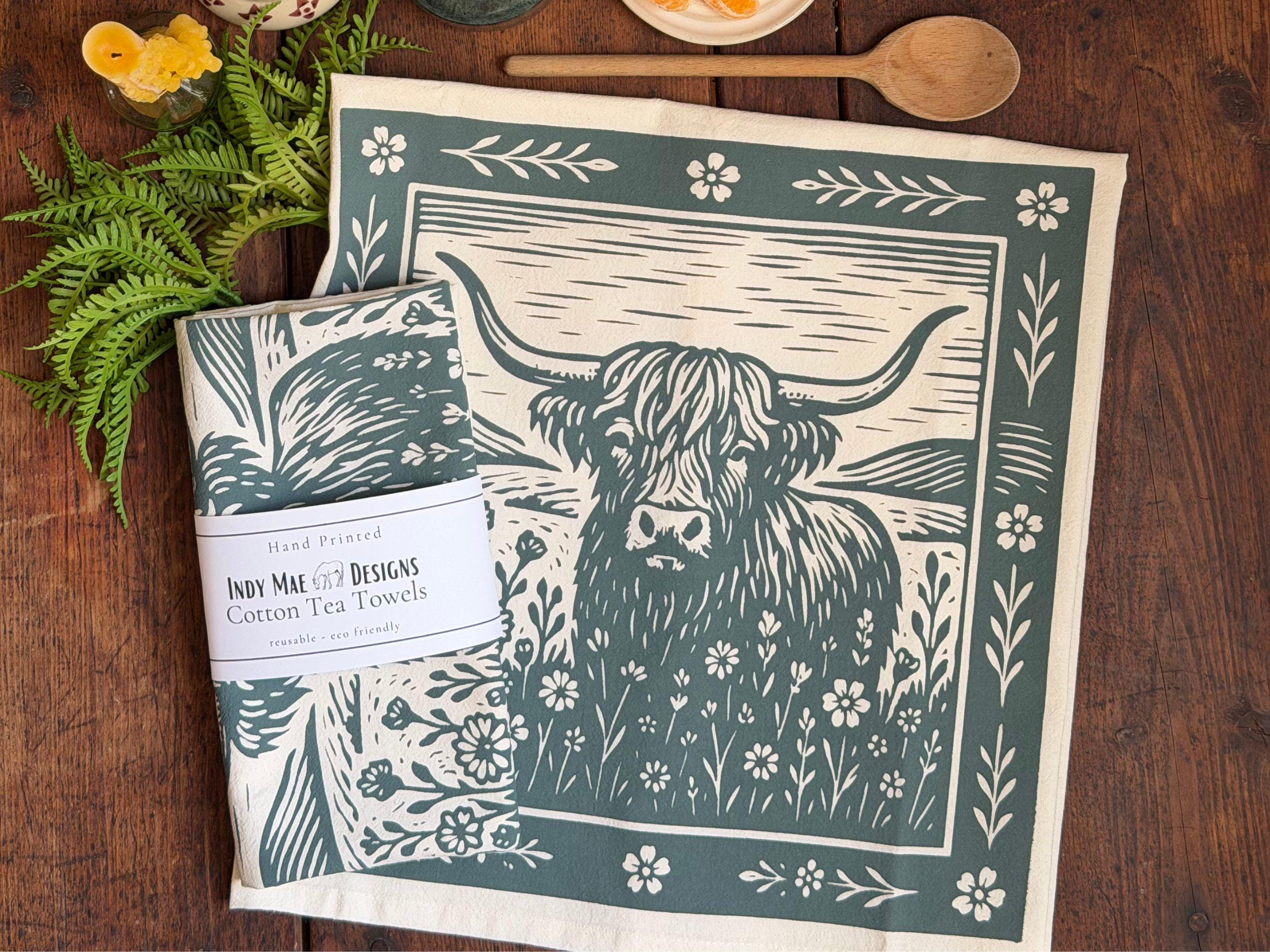 Bring warmth, character, and slow-made beauty into your kitchen with this hand-printed Highland cow tea towel. Each towel is printed one at a time in my studio, giving it the kind of texture and soul you won’t find in mass-produced kitchen linens.
