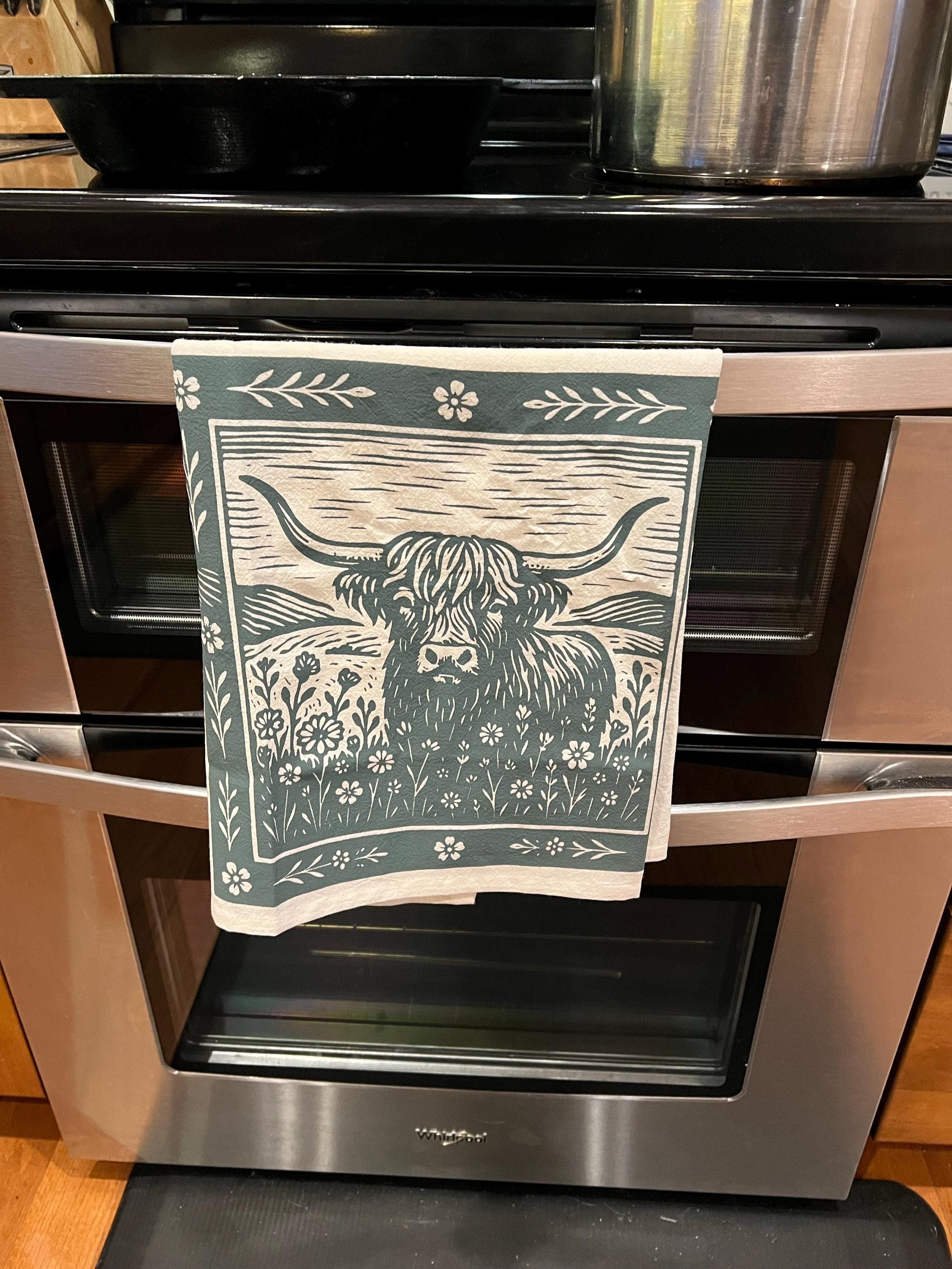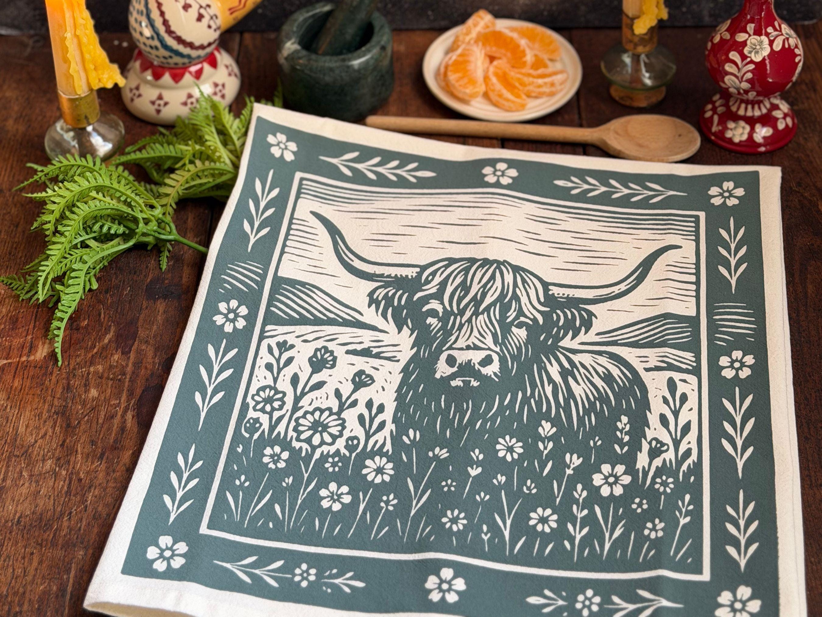 Hand-Printed Highland Cow Tea Towel • Rustic Farmhouse Kitchen Towel • Artisan Block-Print Style • Cow Lover Gift